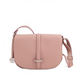 • leather crossbody clutch bag with flap closure grey with pink trims front view