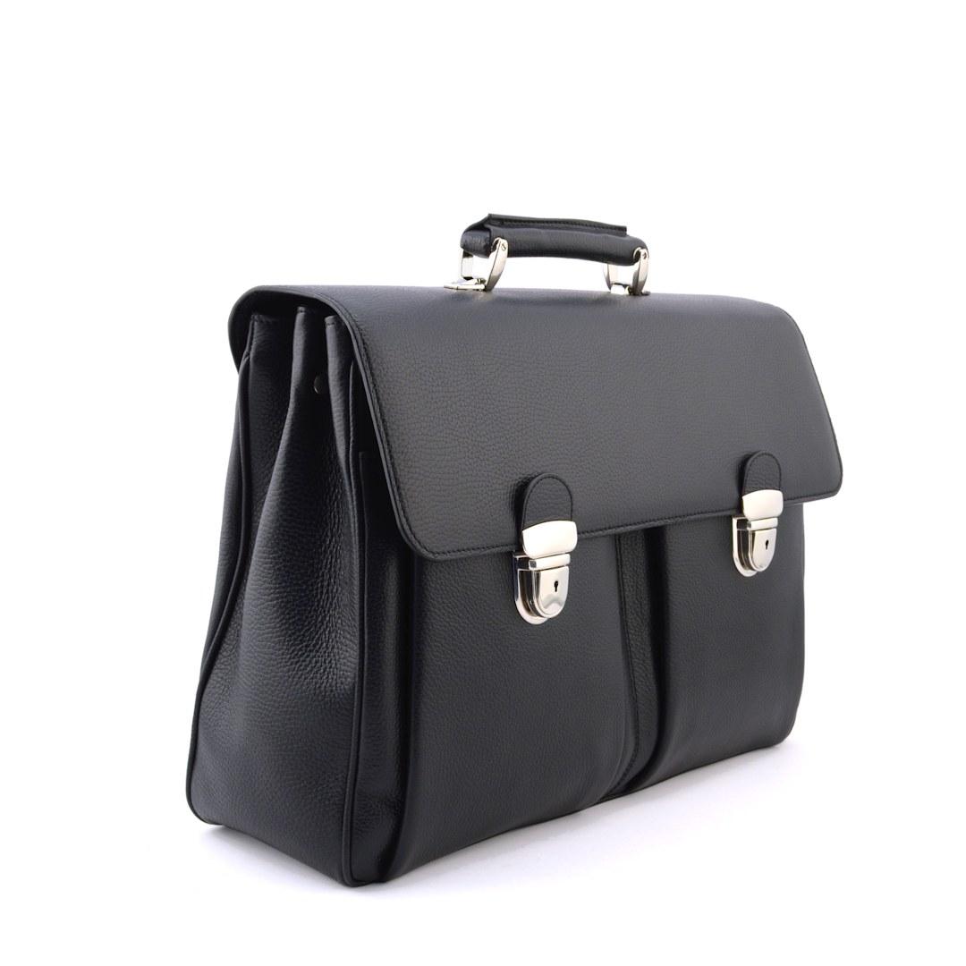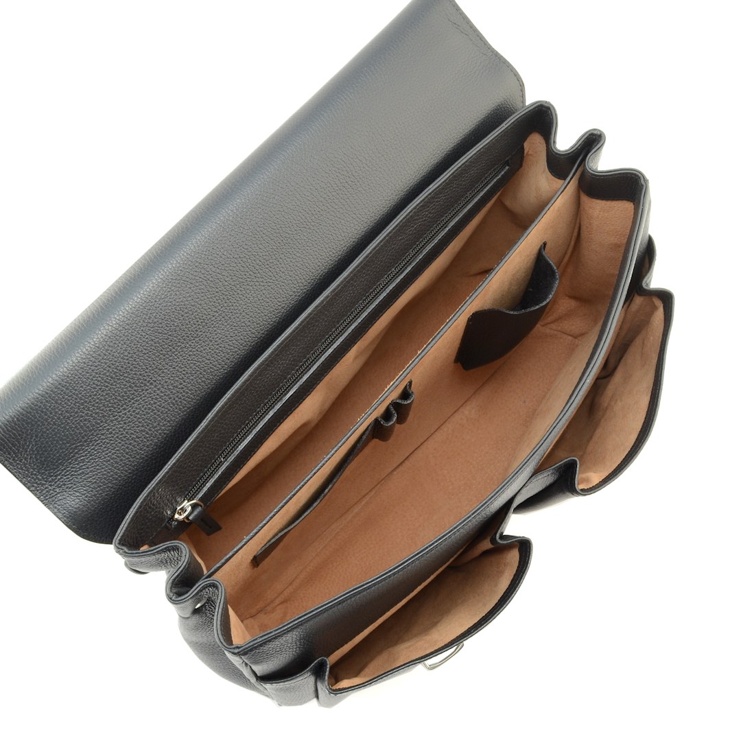 This Italian handmade men’s leather briefcase is crafted from premium calfskin with a tobacco suede lining. Softly structured, it includes two spacious compartments, two external front pockets, a zip pocket and dedicated holders for phone, cards and pens. The flap with double push-lock closure and top handle give it a timeless look, while the adjustable shoulder strap ensures comfort in daily commuting. A professional leather work bag that blends organization, durability and Italian craftsmanship.
