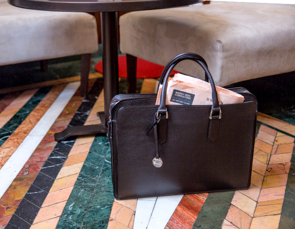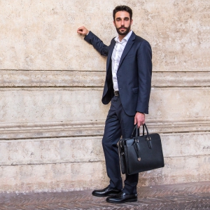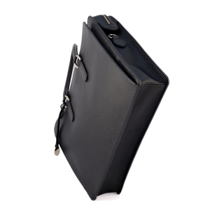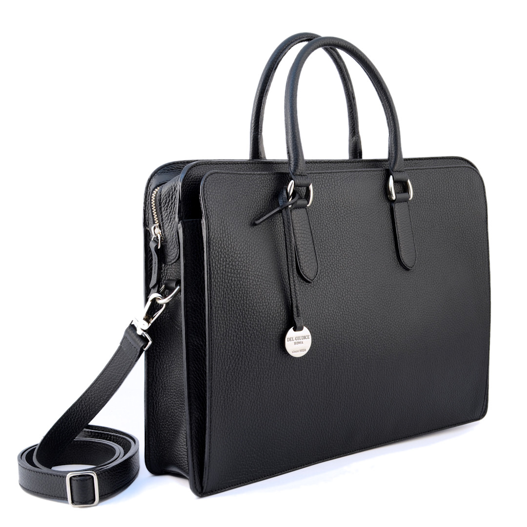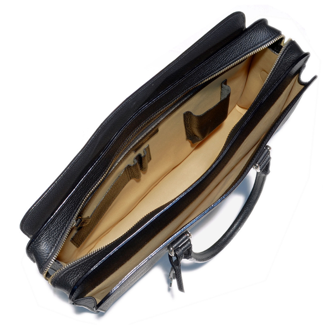 This structured leather briefcase combines refined design and functionality. The zip-top closure keeps your belongings secure, while its sleek shape maintains a professional look. Handcrafted from pebbled calf leather, it features front and back open pockets for quick access to essentials. The main compartment fits a 15″ laptop and work documents comfortably. Inside, a 29 cm zip pocket and multiple slots organize phone, cards, and pens. Its well-balanced structure ensures everyday practicality without sacrificing style. With double handles and an adjustable strap, this leather briefcase adapts to business meetings, travel, or daily commutes. A timeless choice for professionals and lawyers alike.