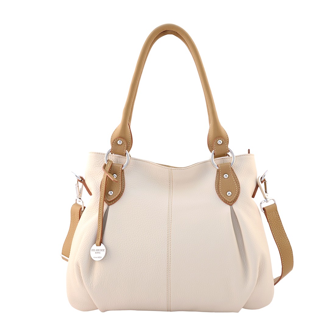 Handmade leather shoulder bag, practical and capacious, with top zip closure. Thanks to the double shoulder handles and the adjustable strap it can be worn by shoulder or crossbody.