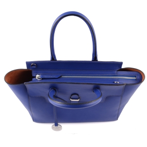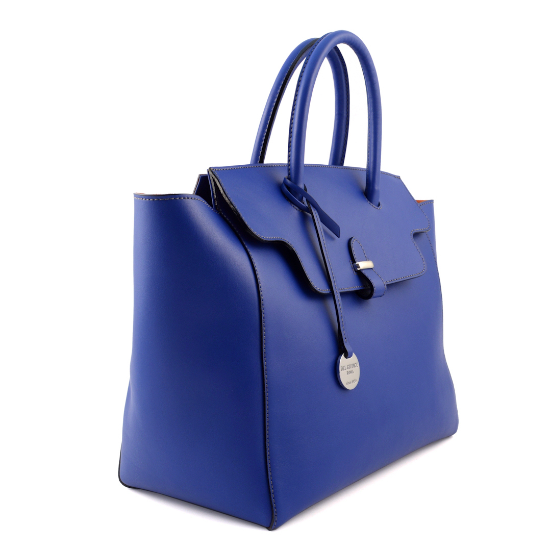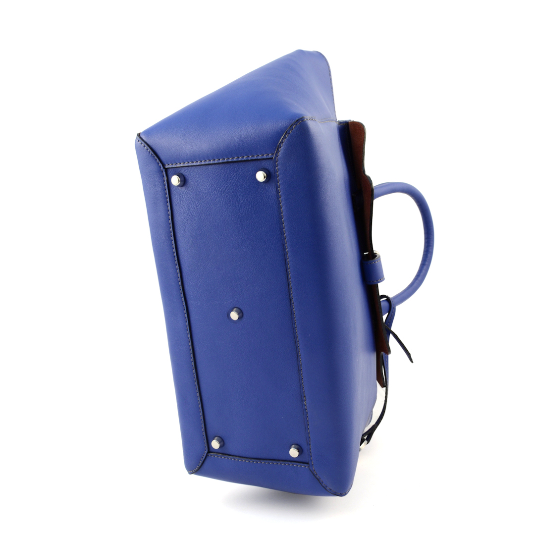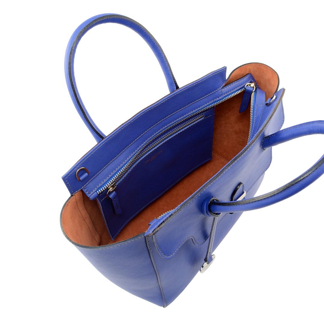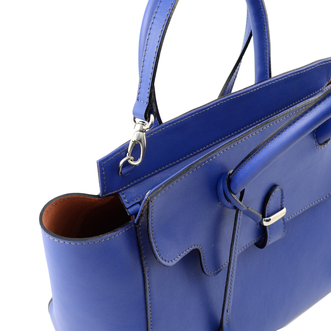 Compact leather handbag from the original shape made with smooth calf leather, full grain, softly structured and enhanced from the suede leather lining; to wear by hand or by shoulder strap.