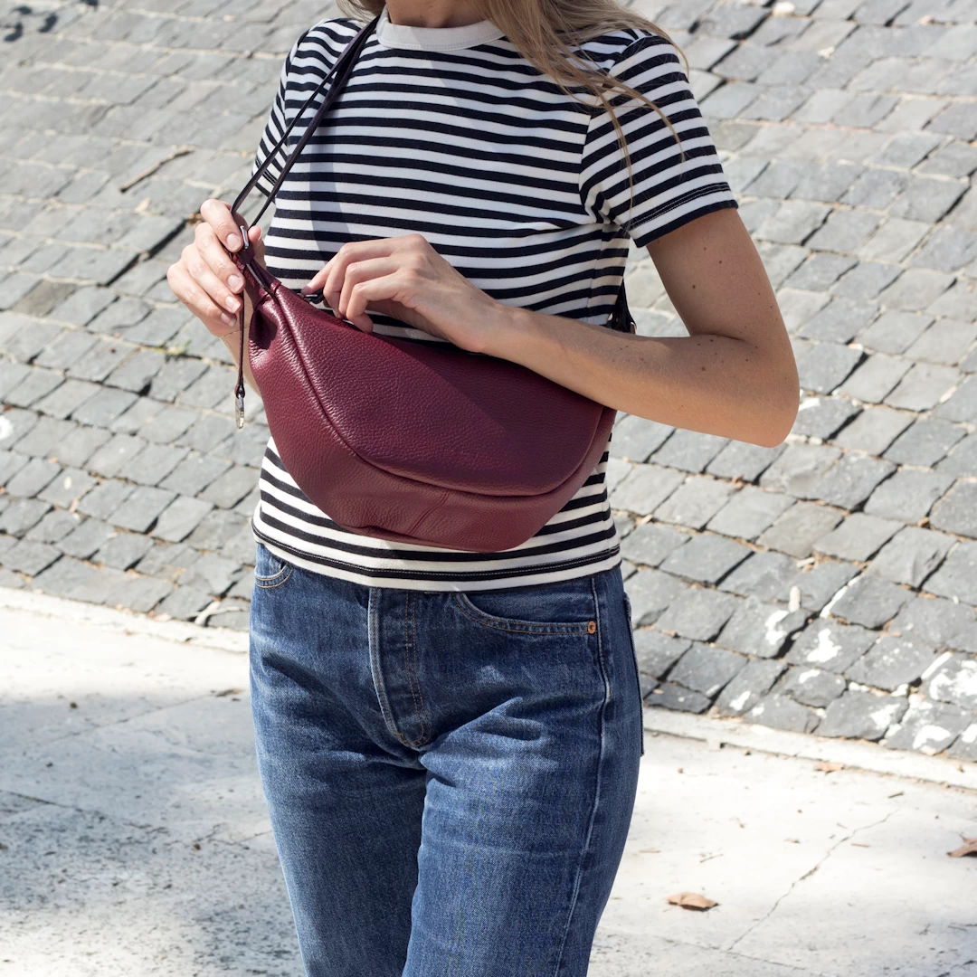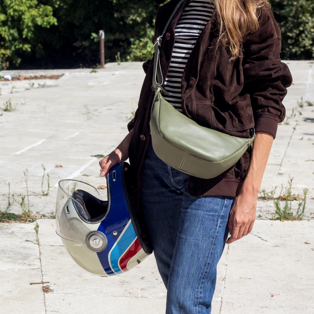 Introducing our mini leather crossbody bag Babe, a perfect blend of style and functionality. Crafted from soft calf pebbled leather, this small shoulder bag is lightweight and designed with a trendy banana shape, making it an essential accessory for any occasion. Featuring an adjustable strap with a slider and a secure zip-top closure, it ensures both durability and elegance. The interior is lined with fabric for added convenience. Versatile and stylish, this mini shoulder bag is perfect for travel and leisure. Though designed as a sporty leather bag, its luxurious appearance makes it suitable for both elegant and casual outfits. Its compact size is ideal for travel, yet it remains spacious enough to be functional for daily essentials like a phone, wallet, and keys. Expertly crafted in Italy, this small Italian leather crossbody bag showcases exquisite craftsmanship, blending traditional techniques with modern, versatile design for today’s fashion-forward woman.
