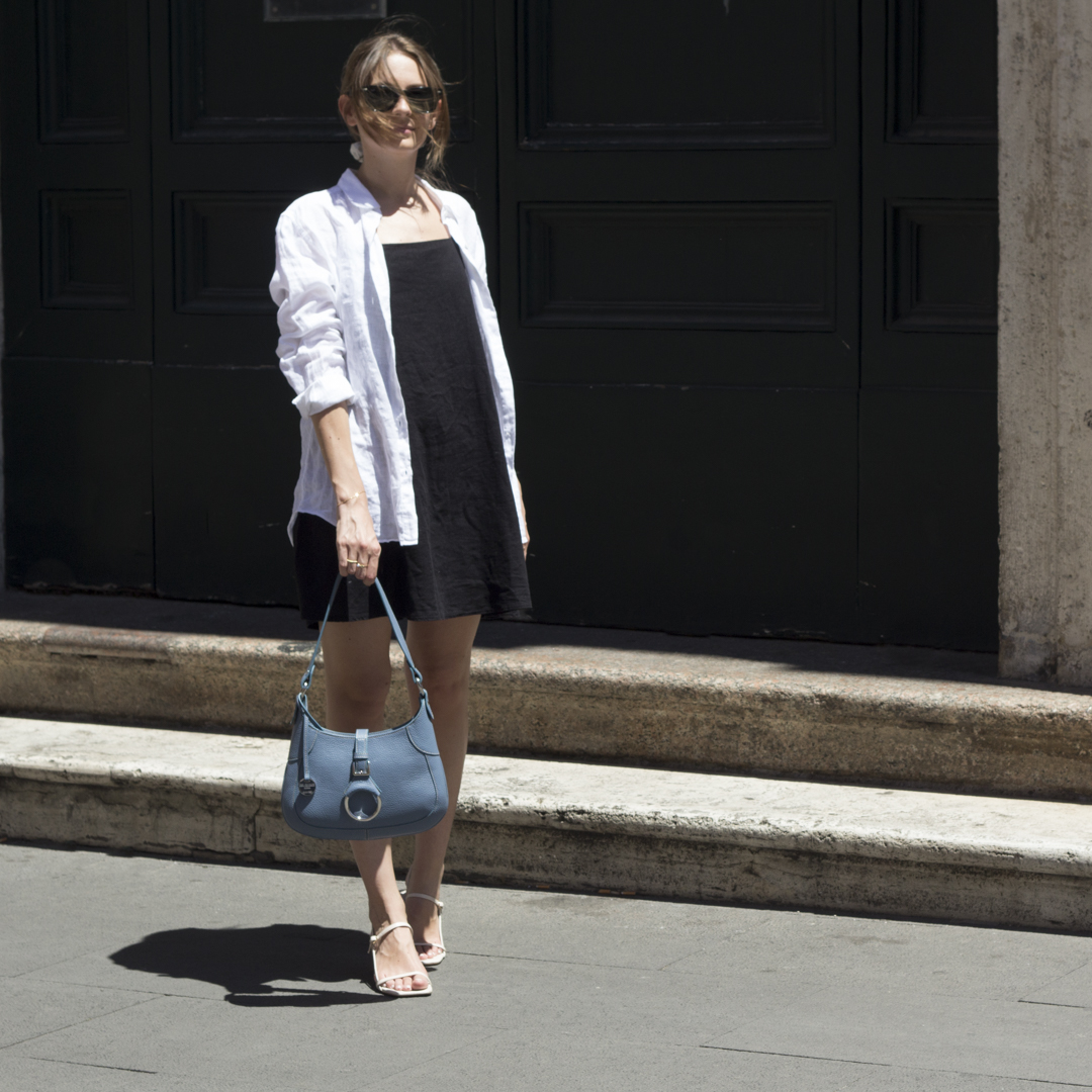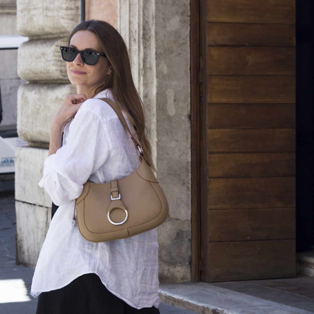 The small leather shoulder bag Flavia, is a modern reinterpretation of one of our past models, which was designed over 20 years ago and is characterized by its classic and elegant design. In particular, Flavia has been revisited, utilizing calf leather. What sets this small leather shoulder bag apart is its main accessory: a central ring supported and secured to the bag by a finely crafted leather buckle. This refined detail not only attests to the high quality of the craftsmanship but also identifies it as a classic piece of Italian leather goods.