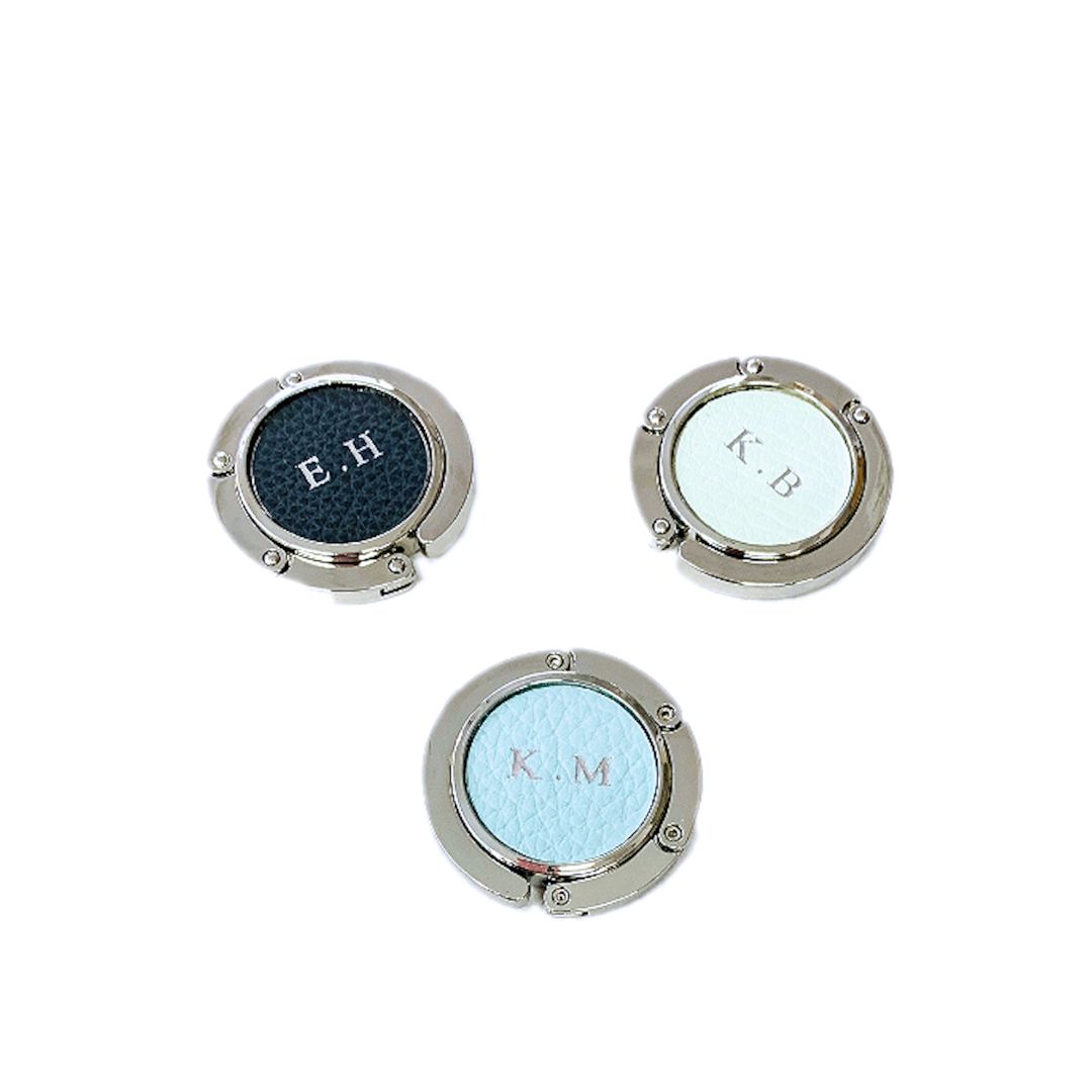 Foldable purse hook for table with Italian leather trim, handmade and customizable with initials. A stylish and functional accessory for your handbag.