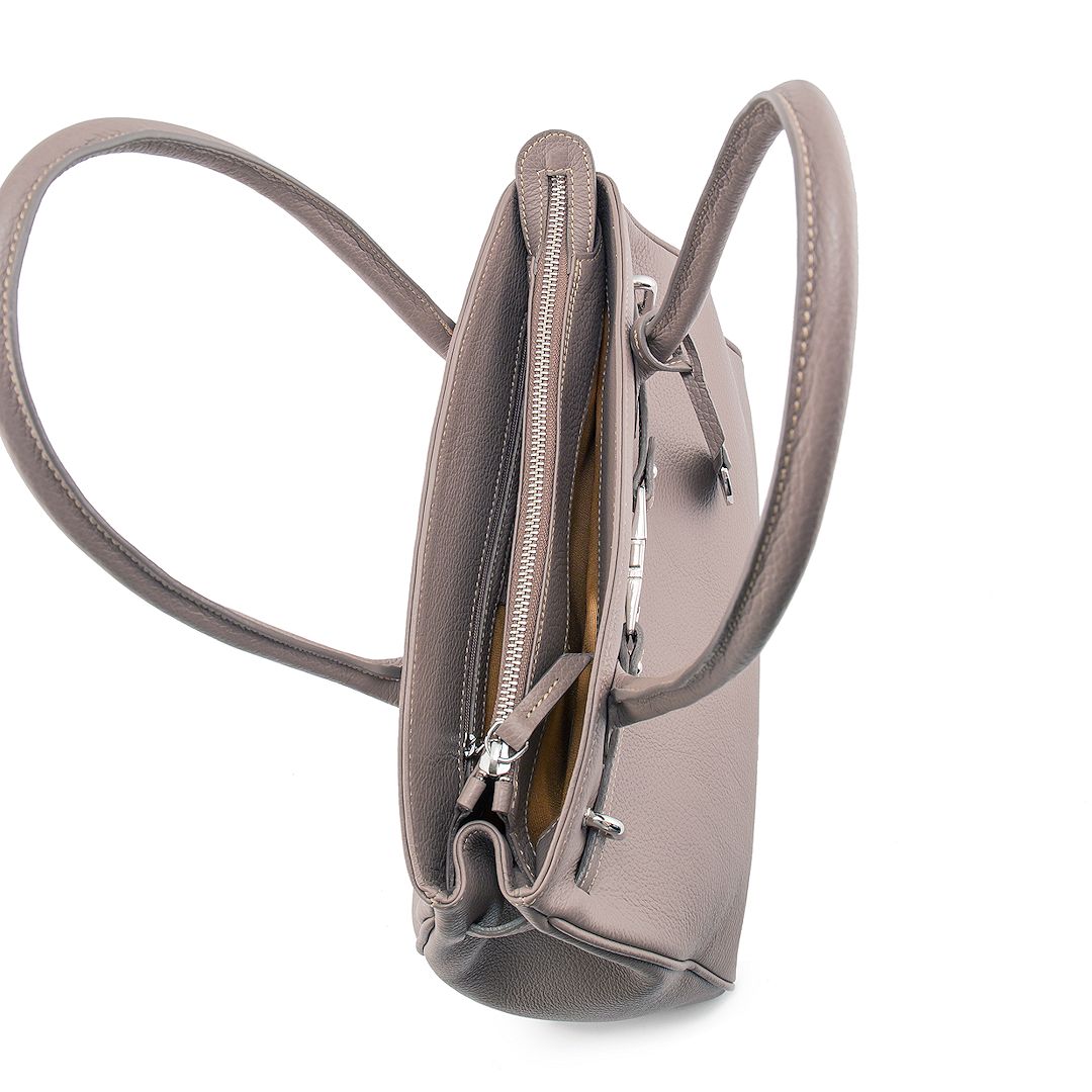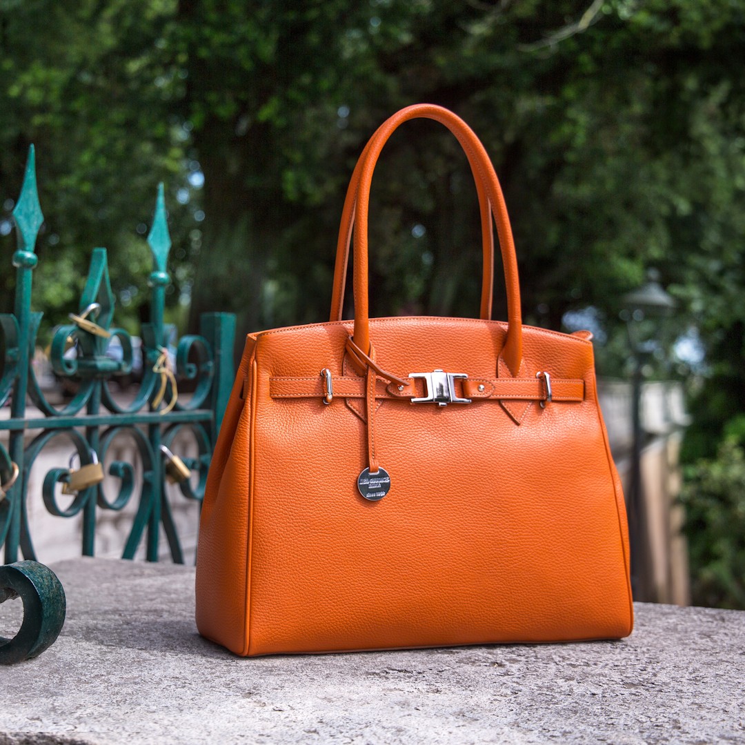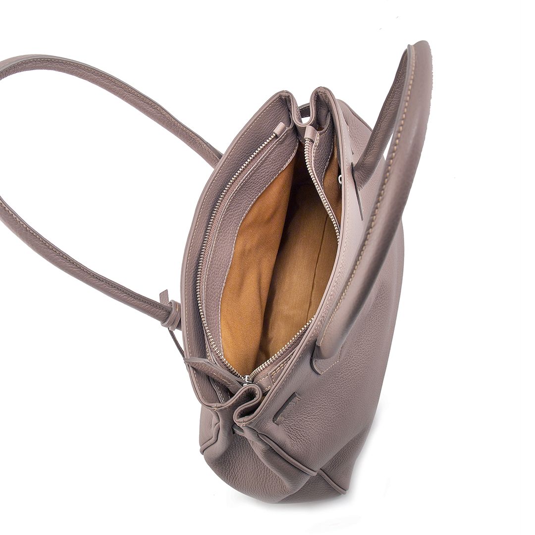 Borsa artigianale in pelle per donna con tre scomparti interni da indossare a mano oppure a spalla.